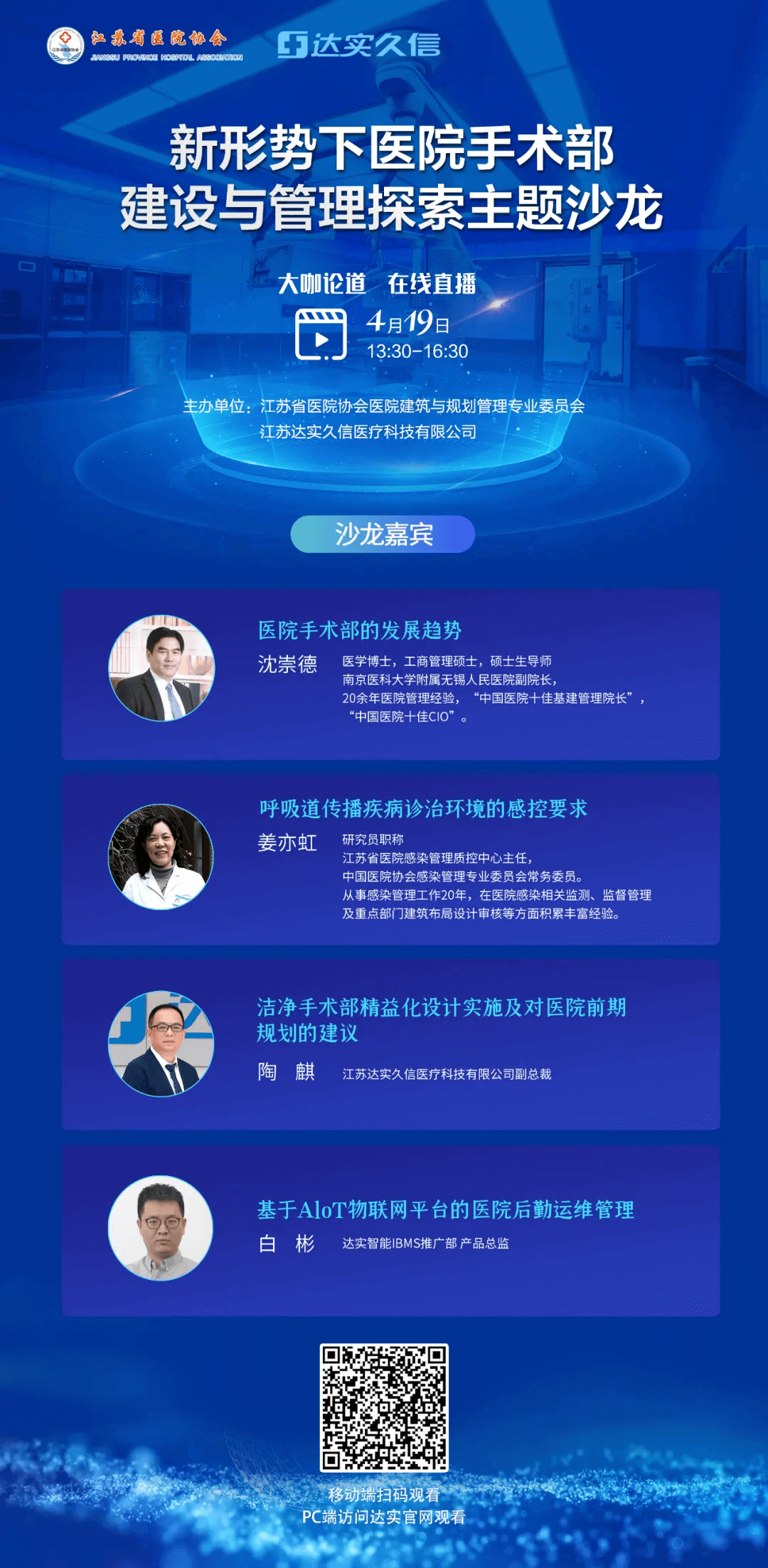 本次直播,邀請到了多位醫療領域的資深大咖,互相碰撞思想,探討心得。4大課題,180分鐘干貨,從理論到實踐,從現狀到發展,一場關于醫院手術部建設與發展的學術盛宴即將開啟。